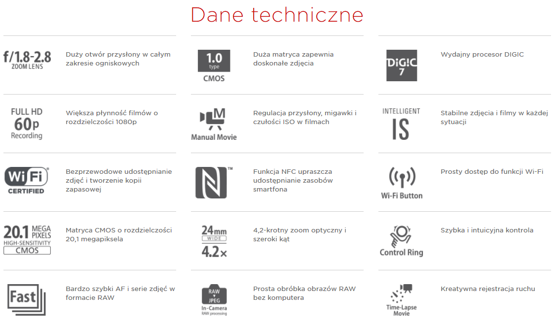 Wyjątkowo jasna i precyzyjna optyka firmy Canon z obiektywem o przysłonie f/1,8–2,8, ogniskowej 24 mm, 4,2-krotnym zoomie optycznym i maksymalnej czułości ISO 25600 zapewniają doskonałe zdjęcia w każdej sytuacji.
